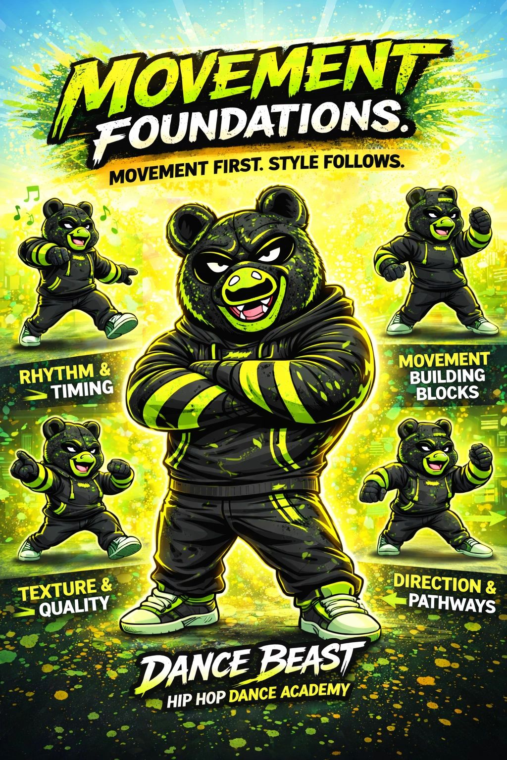 Movement Foundations teaches rhythm and how the body moves before choreography. Dancers learn movement building blocks, texture, direction, and control.